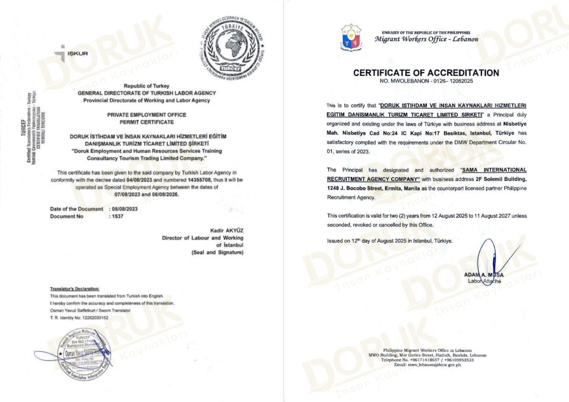 Filipinler Migrant Workers Office – MWO – Lebanon ” NO.MWOLEBONAN-0126-12082025 nolu “Akredite Lisans Belgesi” ile filipinlerden dadı getiren bakıcı ajansıyız.