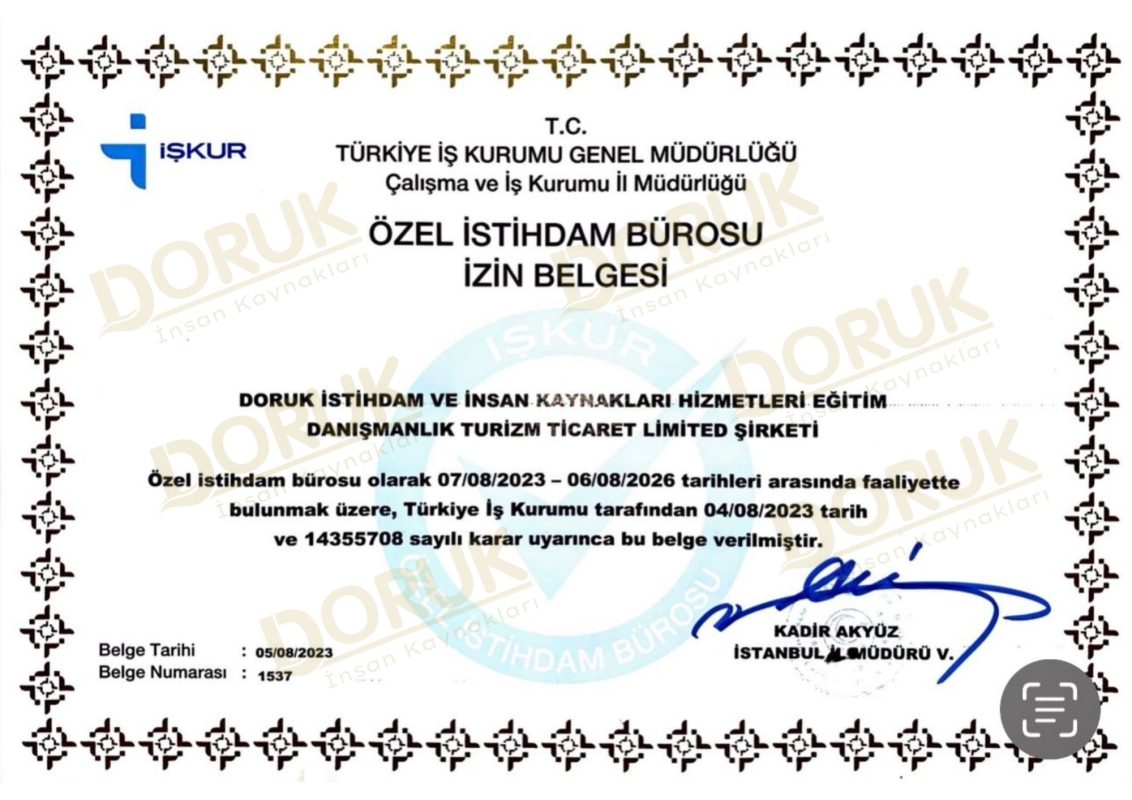 1537 Nolu Türkiye İş Kurumu – İşkur’a bağlı “Özel İstihdam Bürosu” belgesi ile lisanslı bir şekilde insan kaynakları danışmanlık hizmeti veriyoruz.